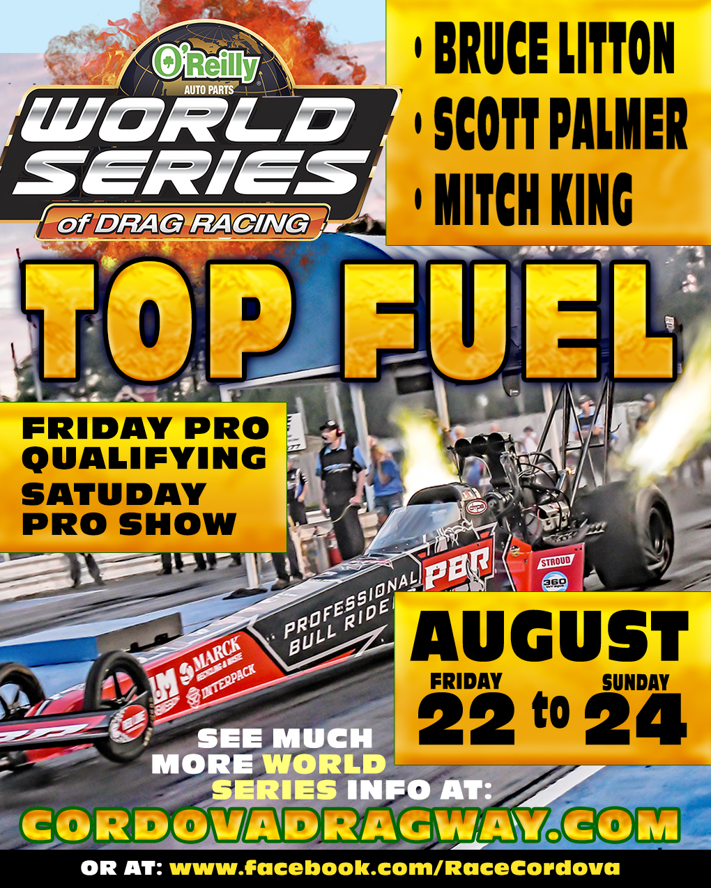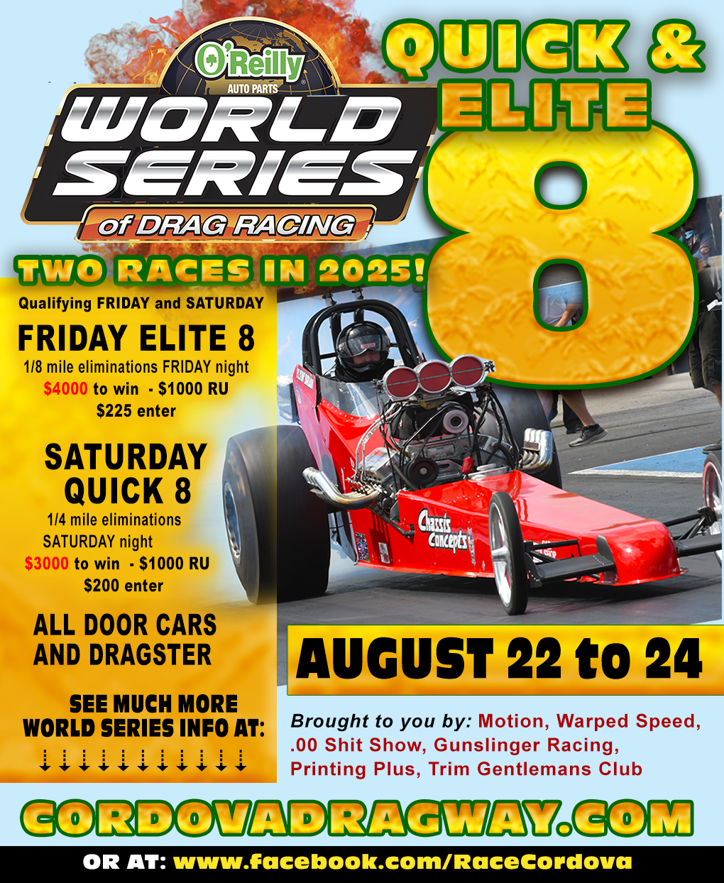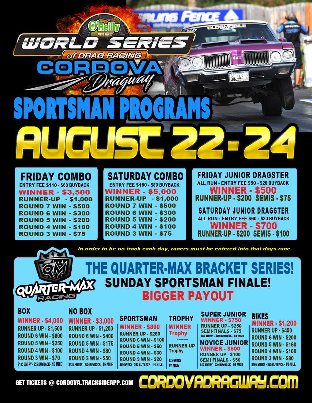 Sunday August 24 – Sportsman Finale – Pit Gate open at 8 AM, Racing begins at 9 AMinfo@cordovadragway.com